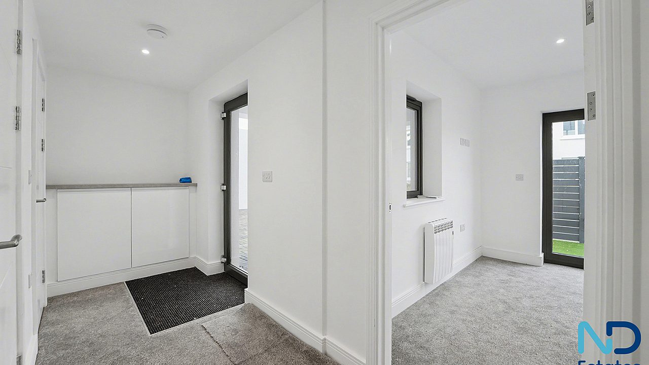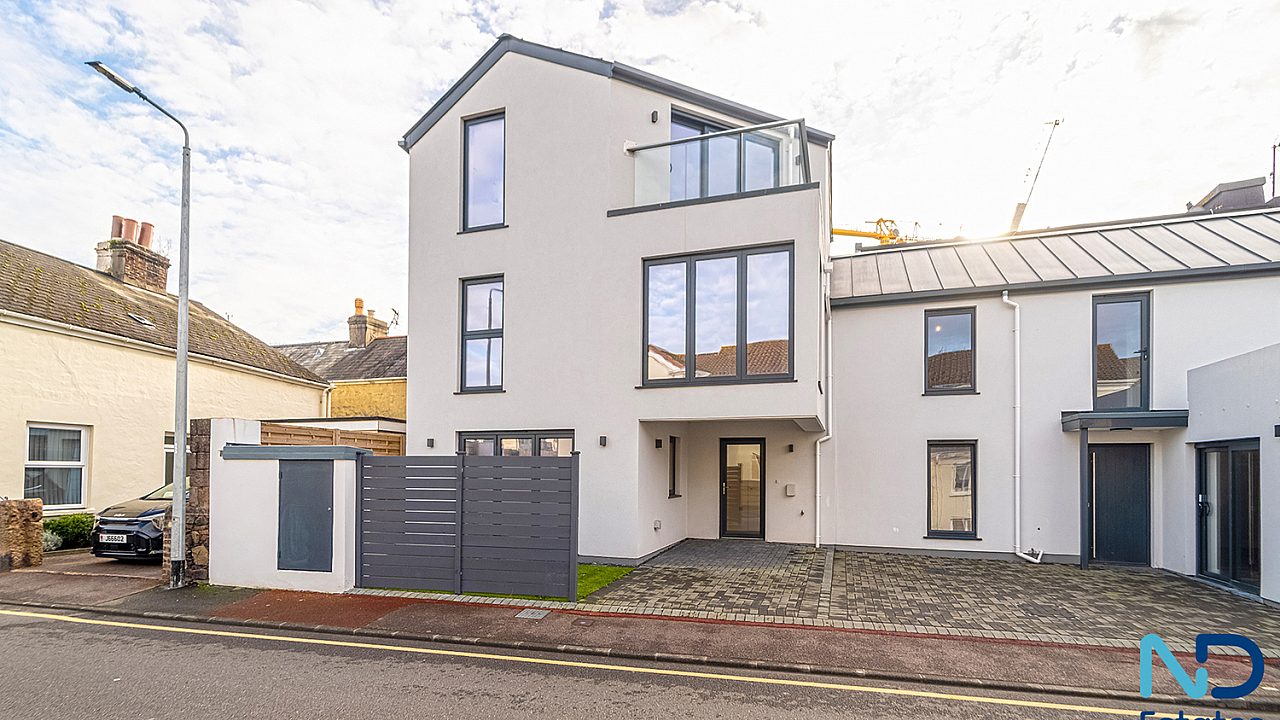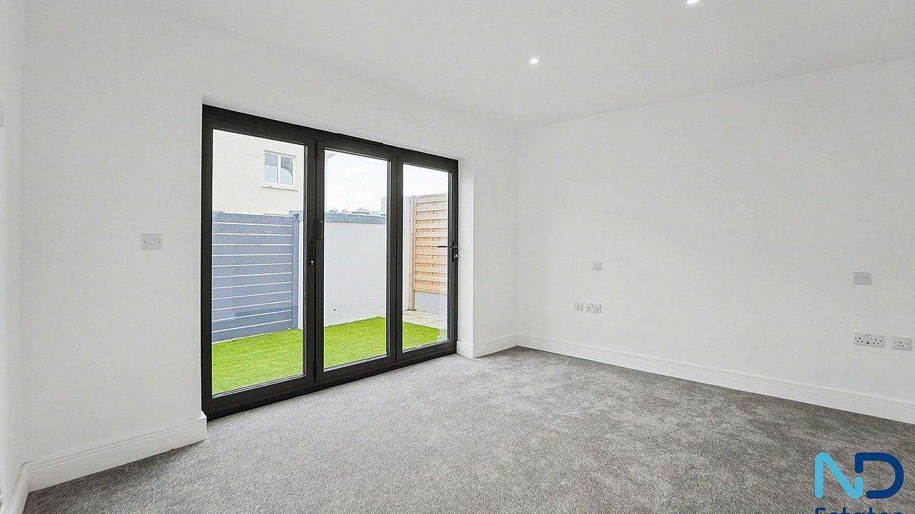 A newly constructed, innovative three-bedroom eco townhouse arranged over three storeys, extending to approximately 120 m². The home is thoughtfully designed with the main living, kitchen, and dining space on the top floor, opening onto a west-facing balcony with open park views—ideal for evening light and sunsets. Additional features include driveway parking (EV-ready) and a small patio area.