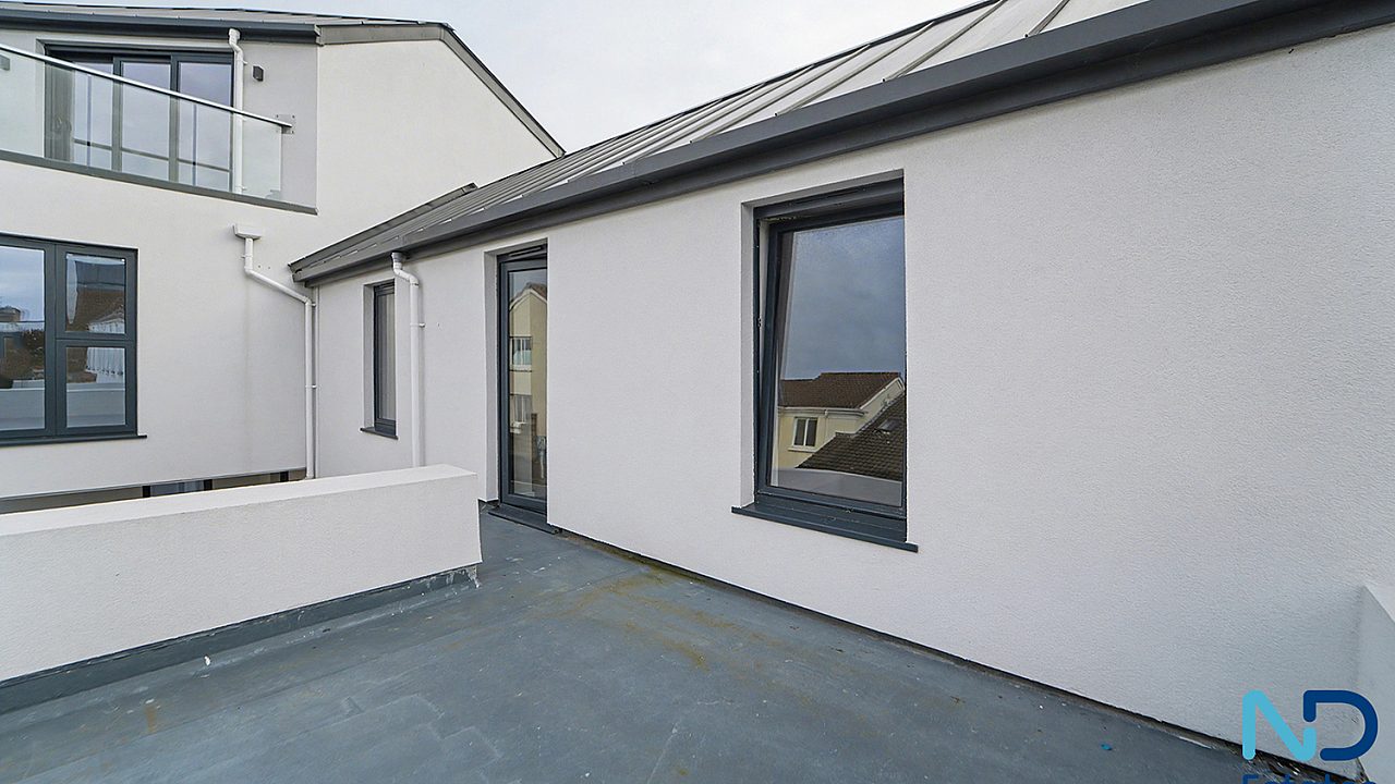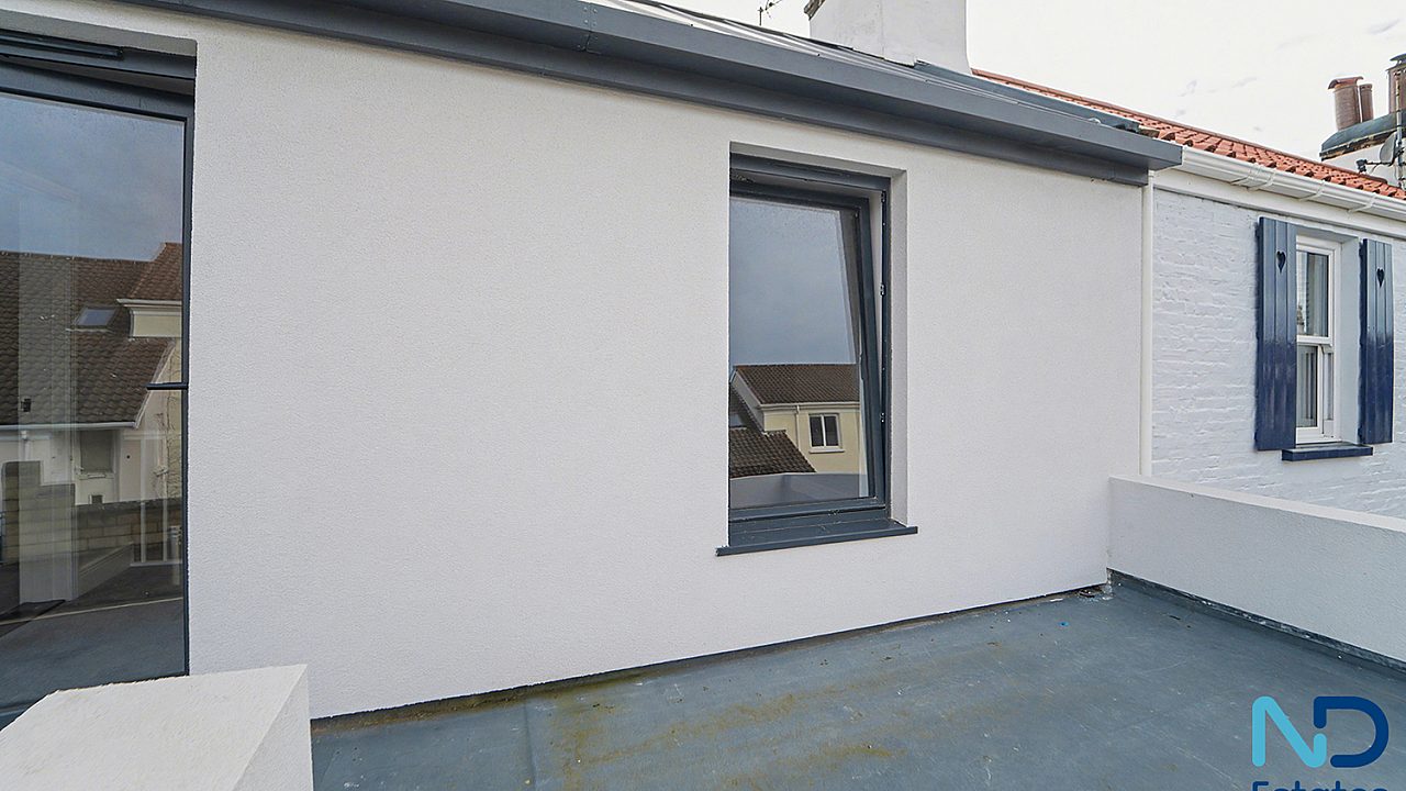 The ground floor comprises a bright living room, an open-plan kitchen and dining area, and a dedicated study—ideal for home working. Upstairs, there are two well-proportioned bedrooms, with the principal bedroom offering potential to utilise the adjoining external area as a balcony, subject to the necessary planning permission.
